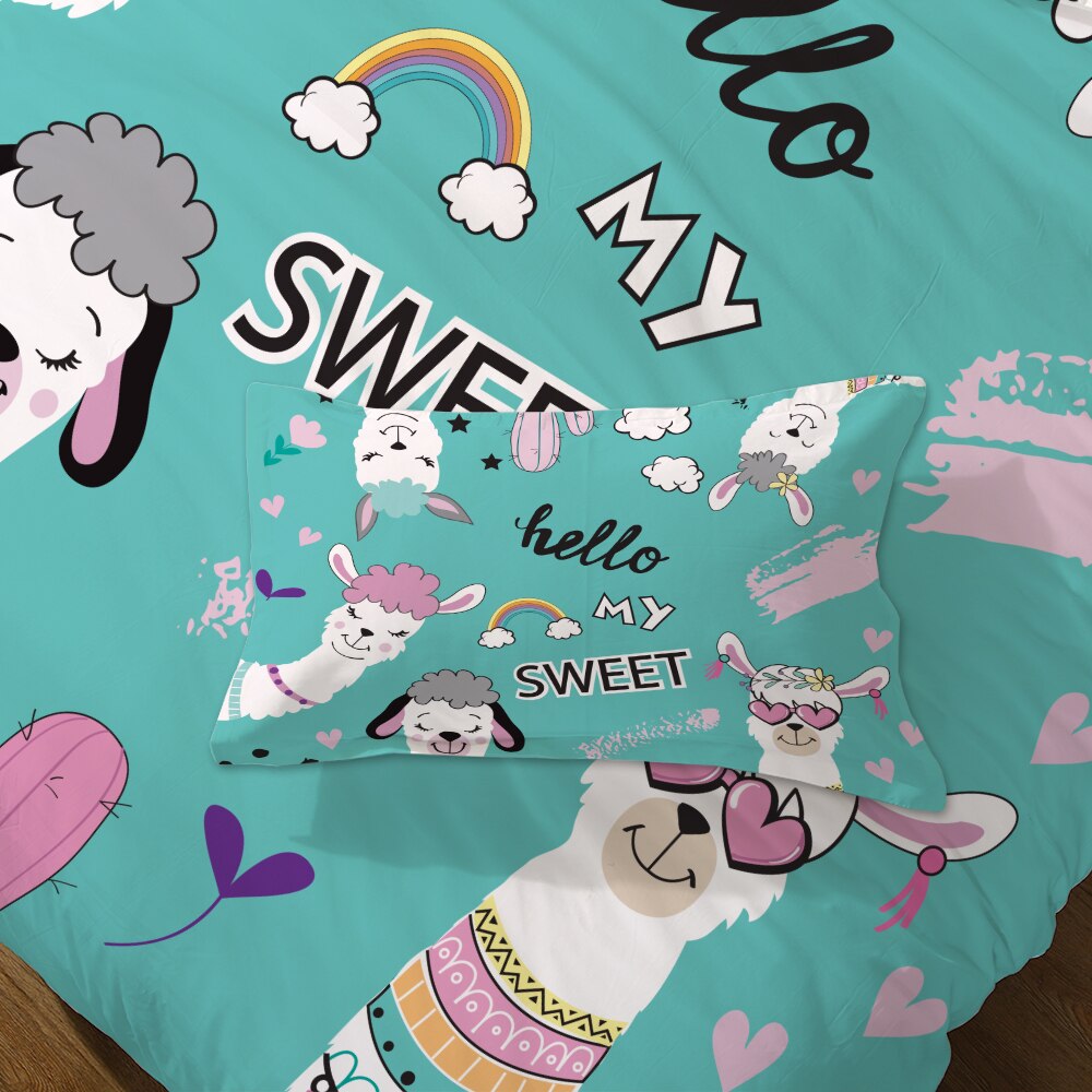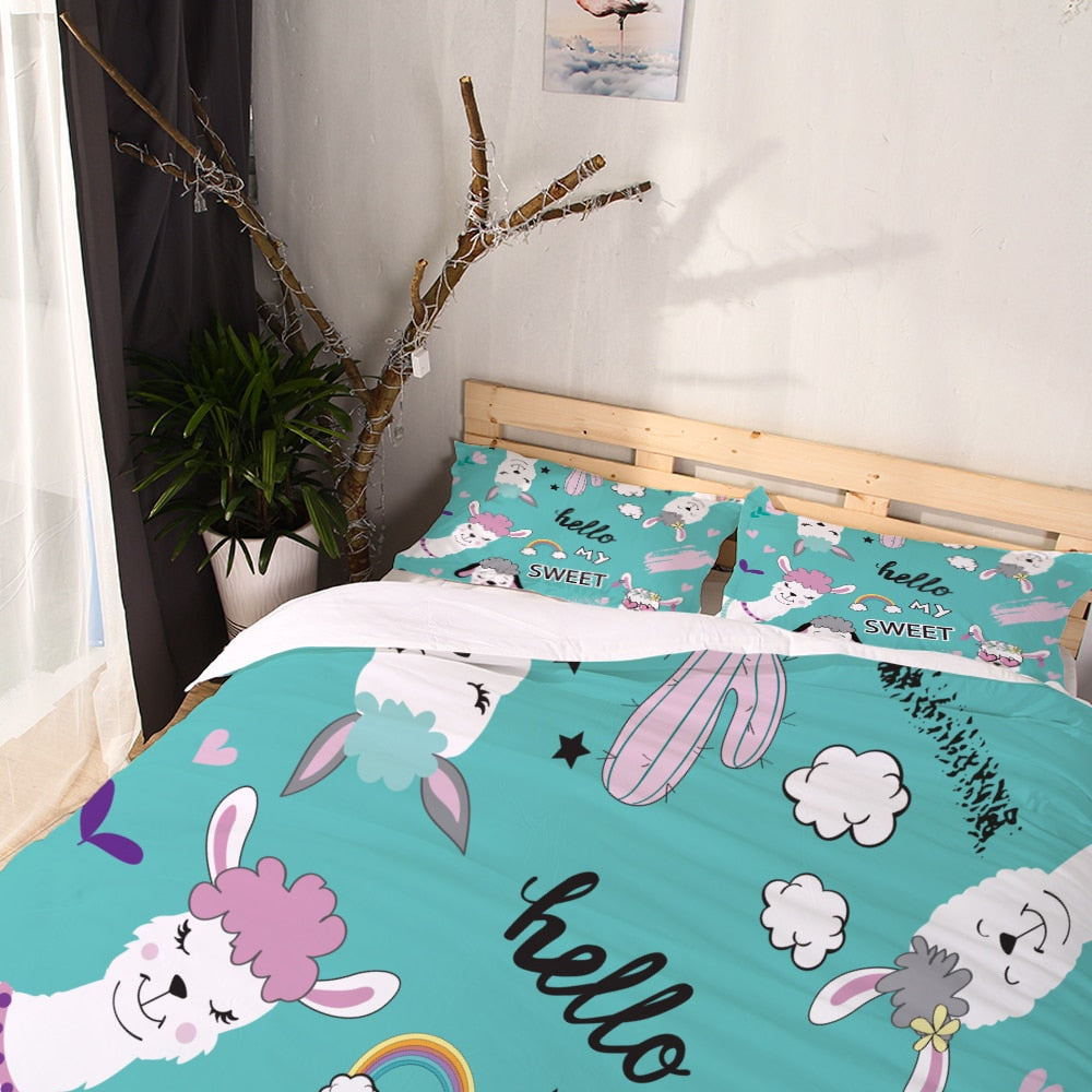 Teal Blue 2/3-Piece Cartoon Alpaca / Llama Print Duvet Cover Set