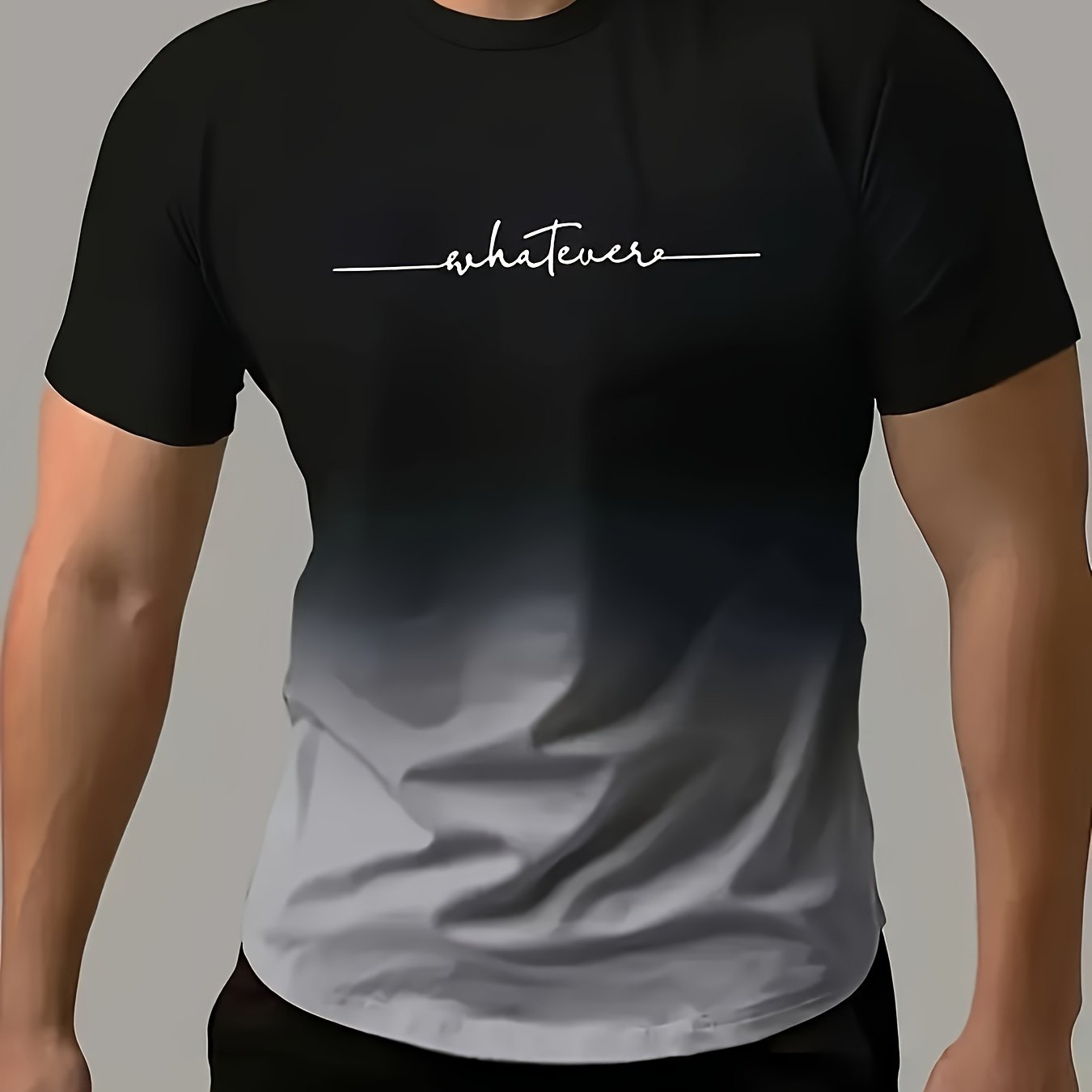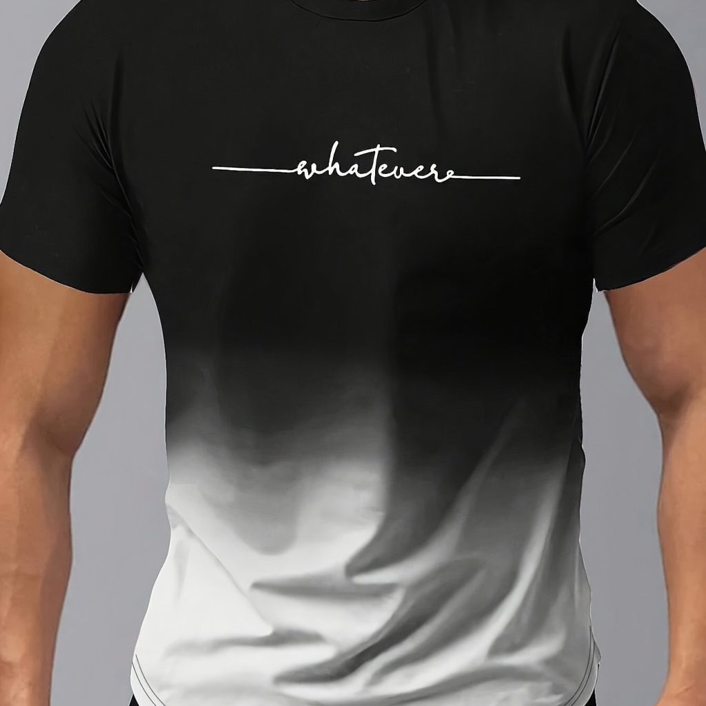 “Whatever” Print Gradient Crew Neck T-shirt For Men, Trendy Casual Short Sleeve Top, Men’s Tee For Summer Outing