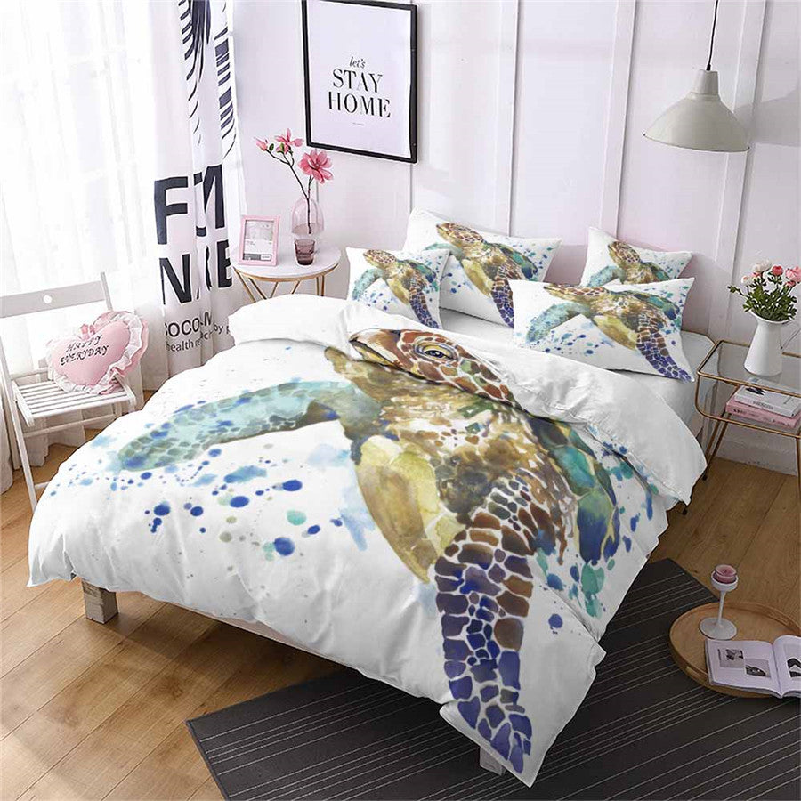White 3-Piece Watercolor Sea Turtle Duvet Cover Bedding Set