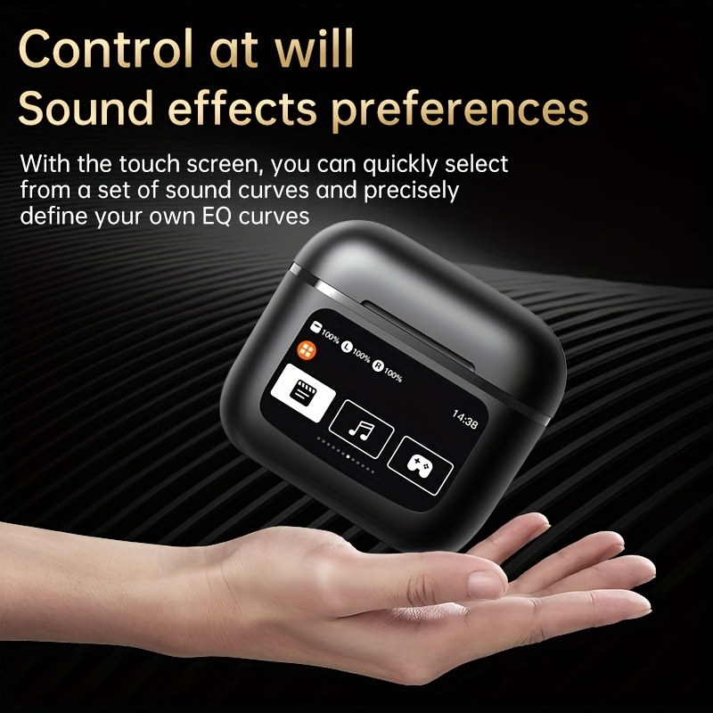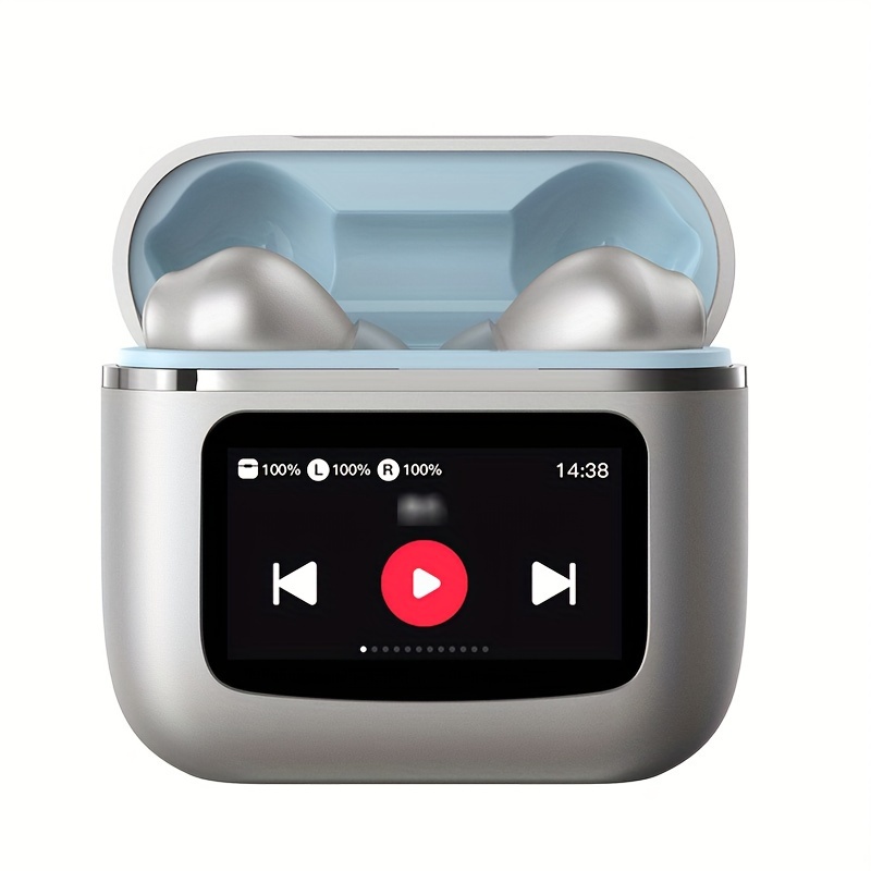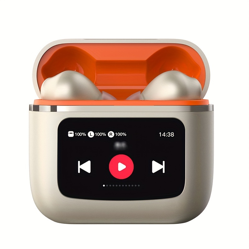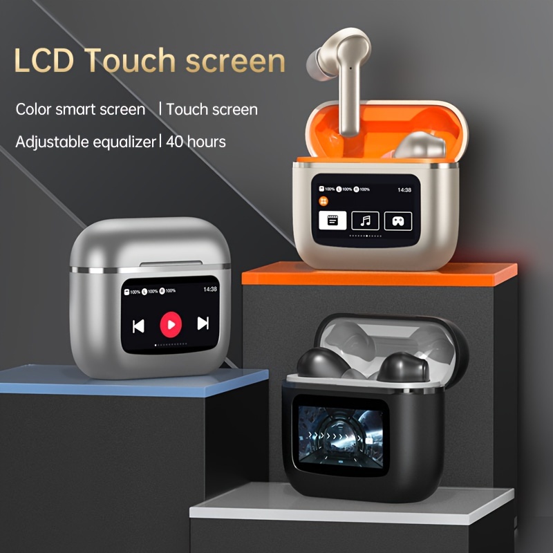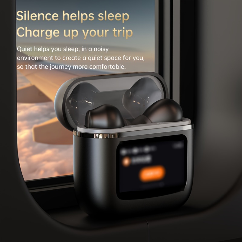Wireless Earbuds with LCD Touch Screen Display, Smart Noise-Canceling Sleep-Aid Earphones, Ergonomic Design, 40-Hour Long Battery Life, Rechargeable Lithium Polymer Battery, Includes Charging Case and Data Cable
