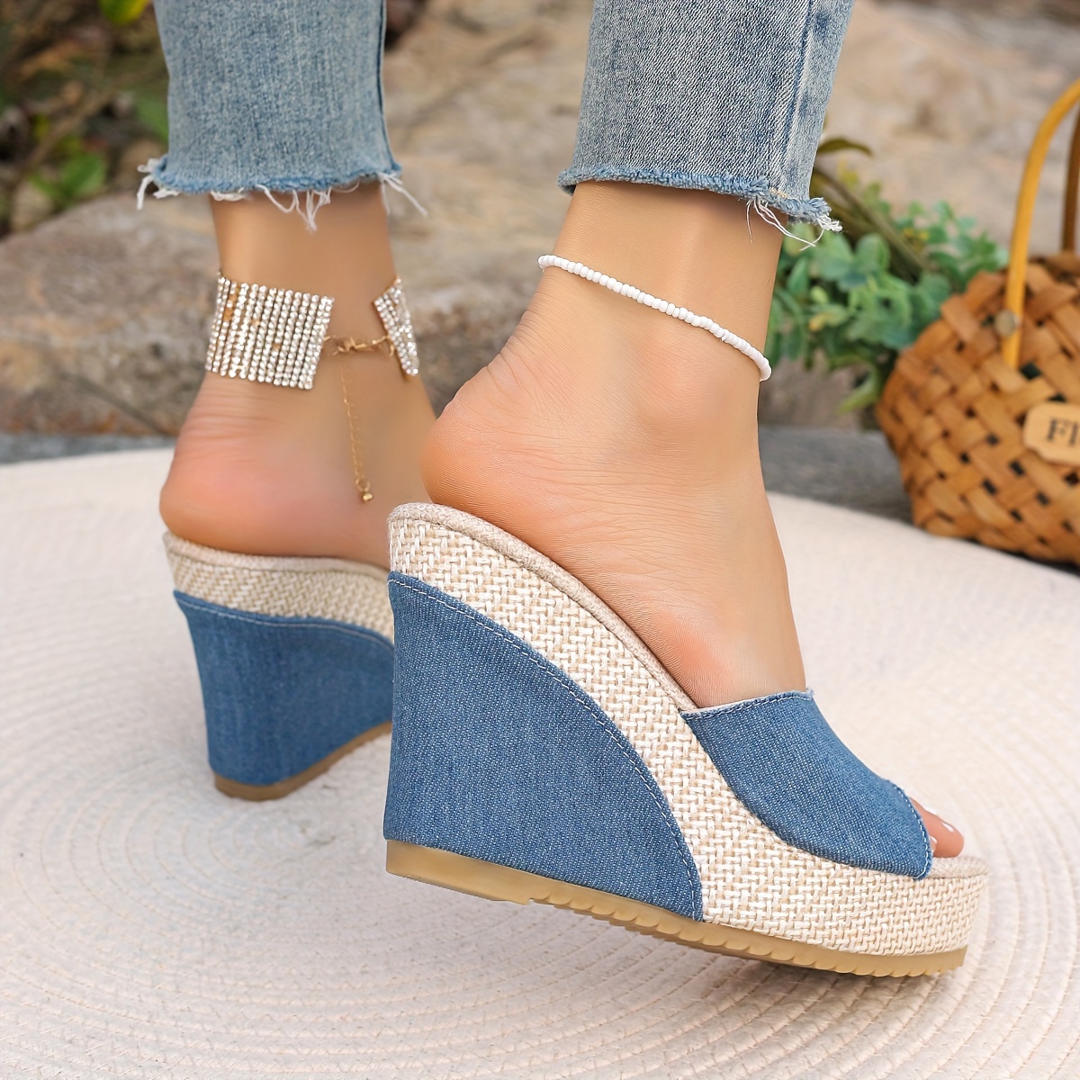 Women’s Solid Color Casual Sandals, Platform Slip On Peep Toe Walking Slides, Comfort Wedge Beach Shoes