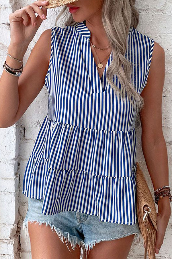 Striped Print Notched Neck Blouse, Casual Short Sleeve Blouse For Spring & Summer, Women’s Clothing