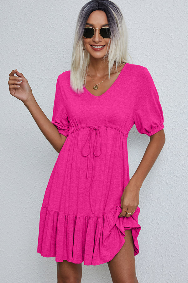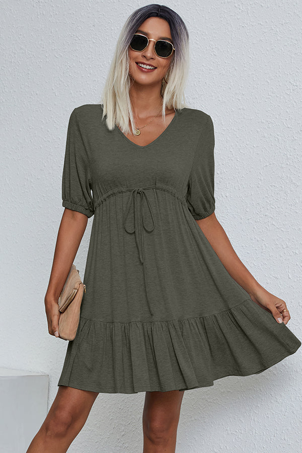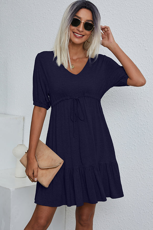 V Neck Drawstring Waist Casual Mini Dress
